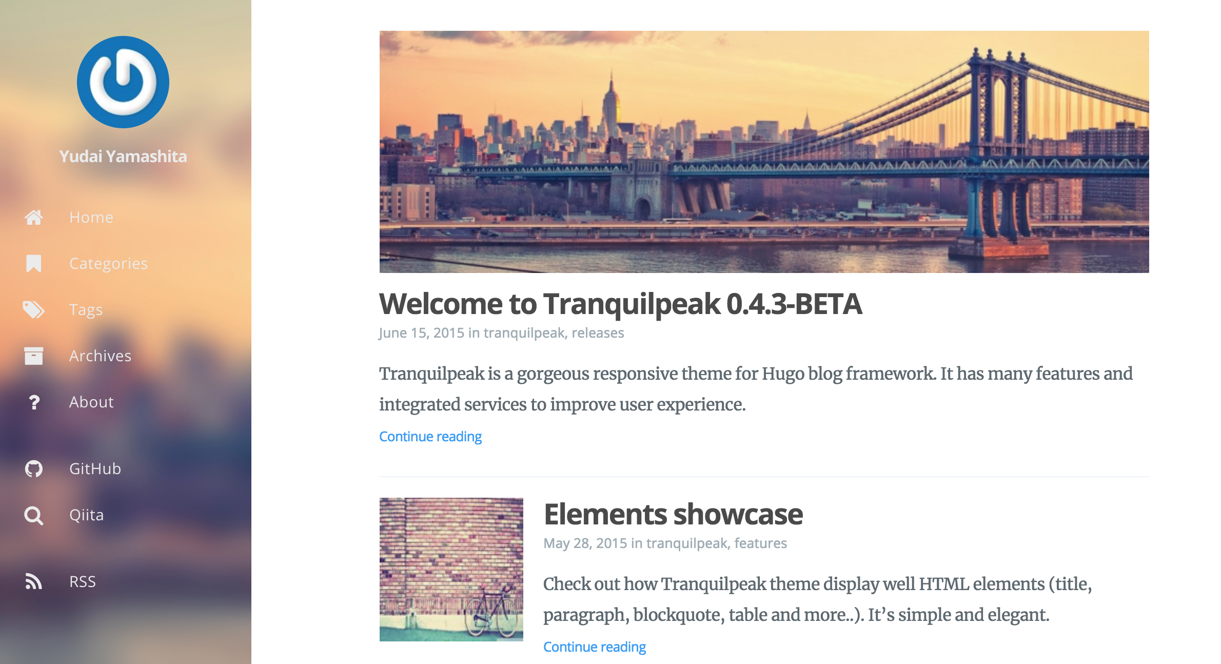 これで、Hugoのシステムは揃ったので、次に自分の作りたいサイトや、好みにあった見た目を用意されたテーマから選んで設定してあげます。Hugoのテーマは、Hugoのテーマ一覧に載っているものから選択可能です。見ていただければわかるのですが、コーポレートサイトや ECサイトのテーマもあるので、それらのシステムも作ることができてしまいます。色々あるので迷いますが、今回はこちらのテーマを使わせていただきます。