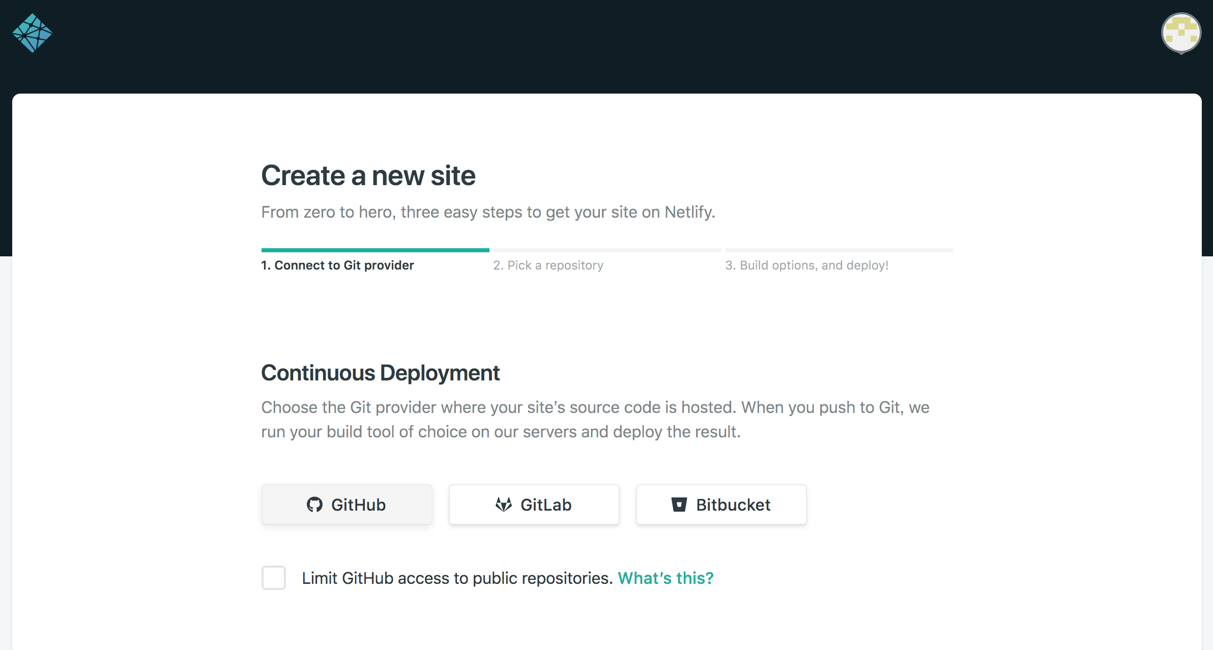 Netlifyでは、GithugやBitbucketのリモートリポジトリを見て、デプロイしてくれます。なので、先ほど作ったサイトをリモートにプッシュします。(Gitの使い方は割愛させていただきます。)