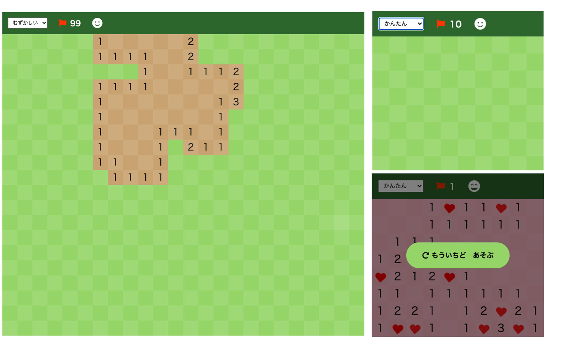 数字をたよりに、爆弾をさけてマス目をあけていくゲームです。
