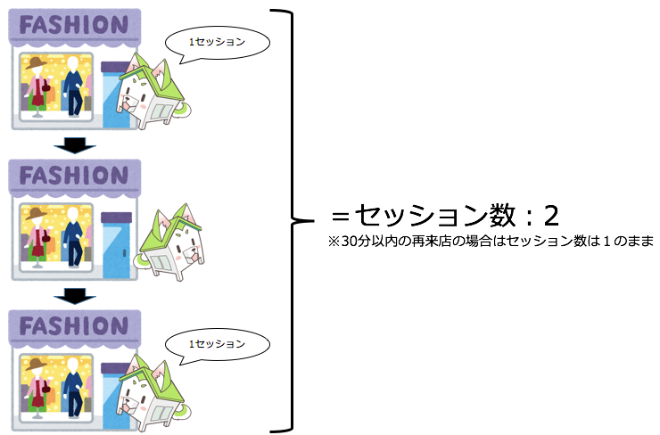 先ほどの例で言うと、すまイヌ君が同じ店に2回来店した場合セッションは2になります。